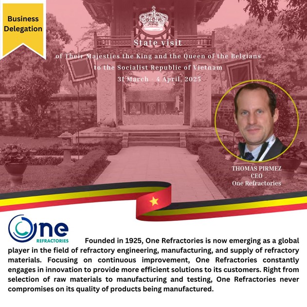 Blog State visit of Their Majesties the King and the Queen of Belgium to Vietnam 12 December 2025 Business Contact Day in Lahore, Pakistan 12 December 2025 One Refractories, première société wallonne à ouvrir une usine au Vietnam 12 December 2025 Exhibiting at the 27th AICCE Cement Conference and Exhibition in Tunis. 12 December 2025 Joint visits with our agent in Jordan 12 December 2025